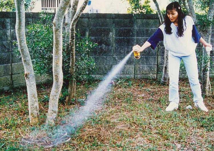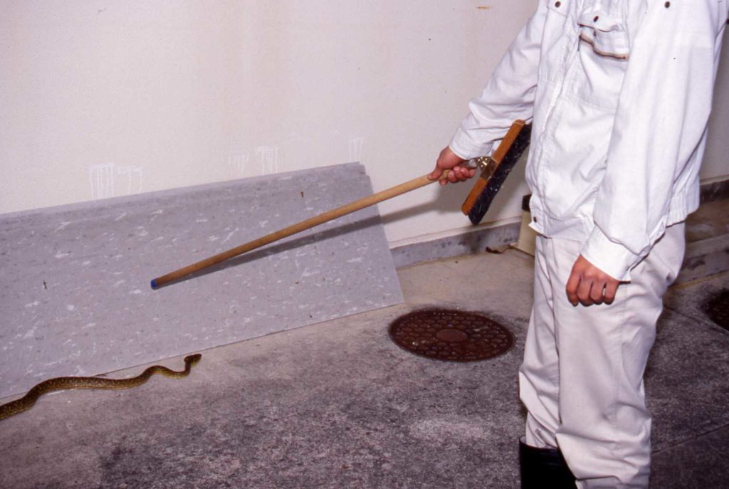 逃がすと危険性と恐怖心が残ります。棒で頭か胴を叩きます。棒は、ほうきなどの長さ1.5m程度のものを用います。ヘビを殺すためのスプレー(ハブノック)があれば吹き付けます。車で通行中なら、轢きます。大けがをさせても、すぐには死にませんが、いずれ死にます。
